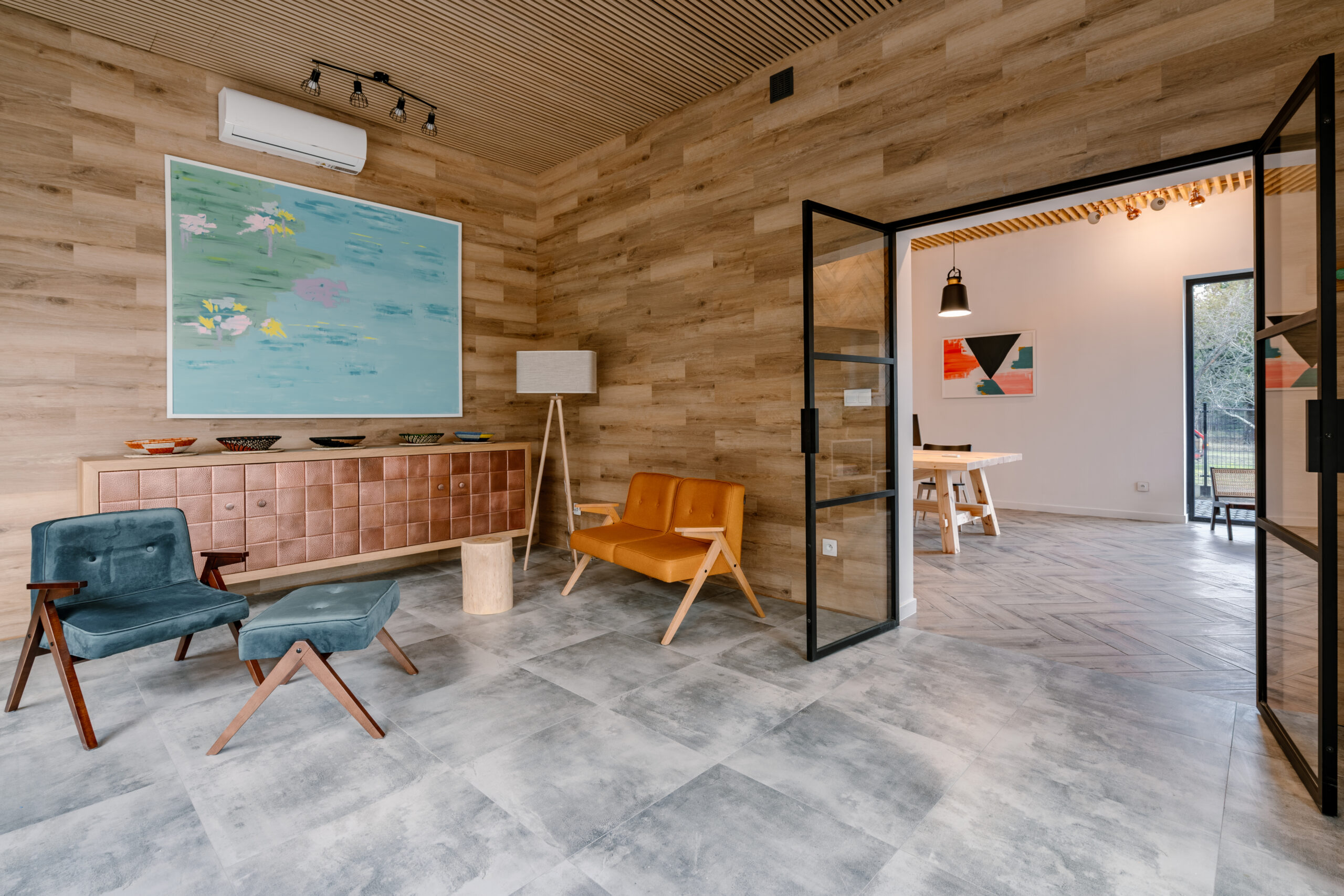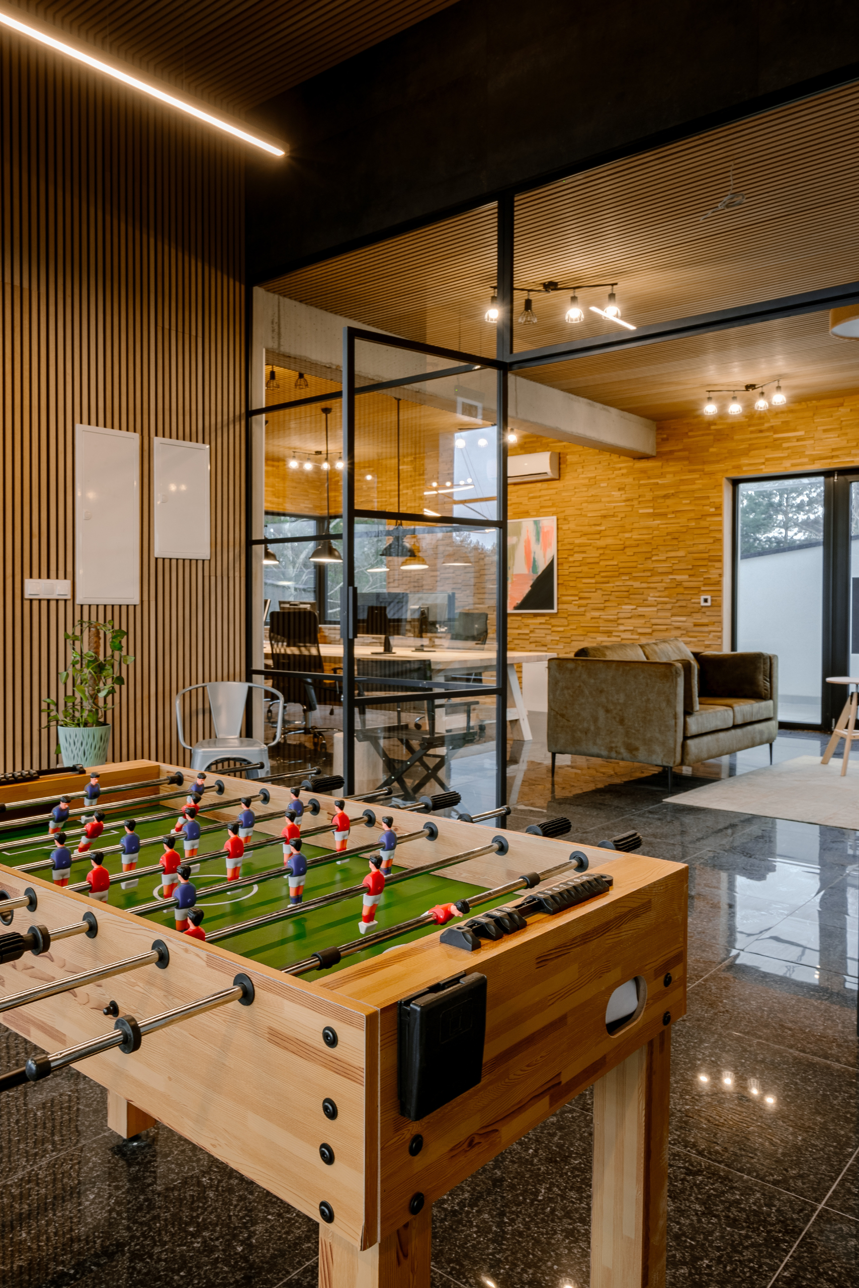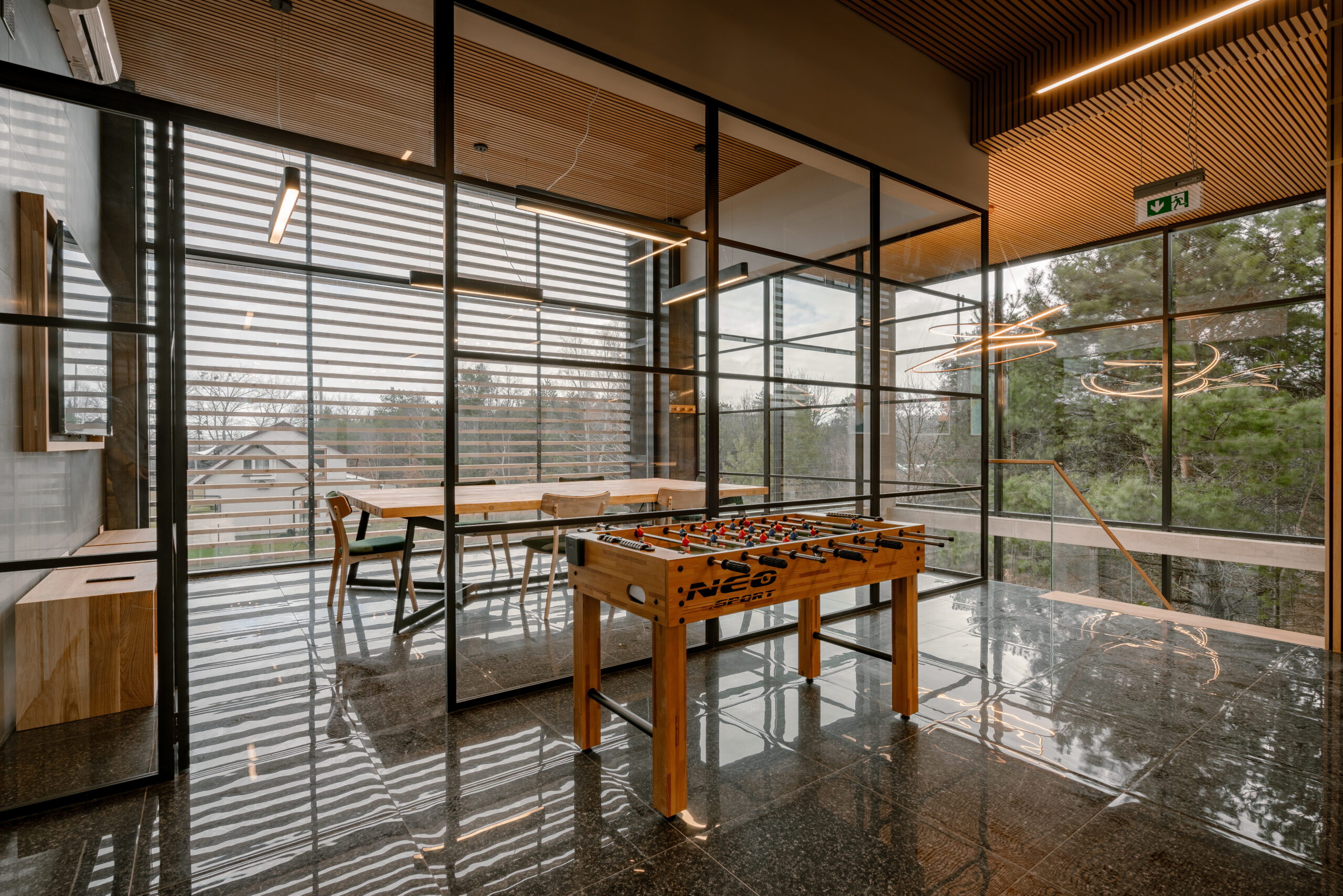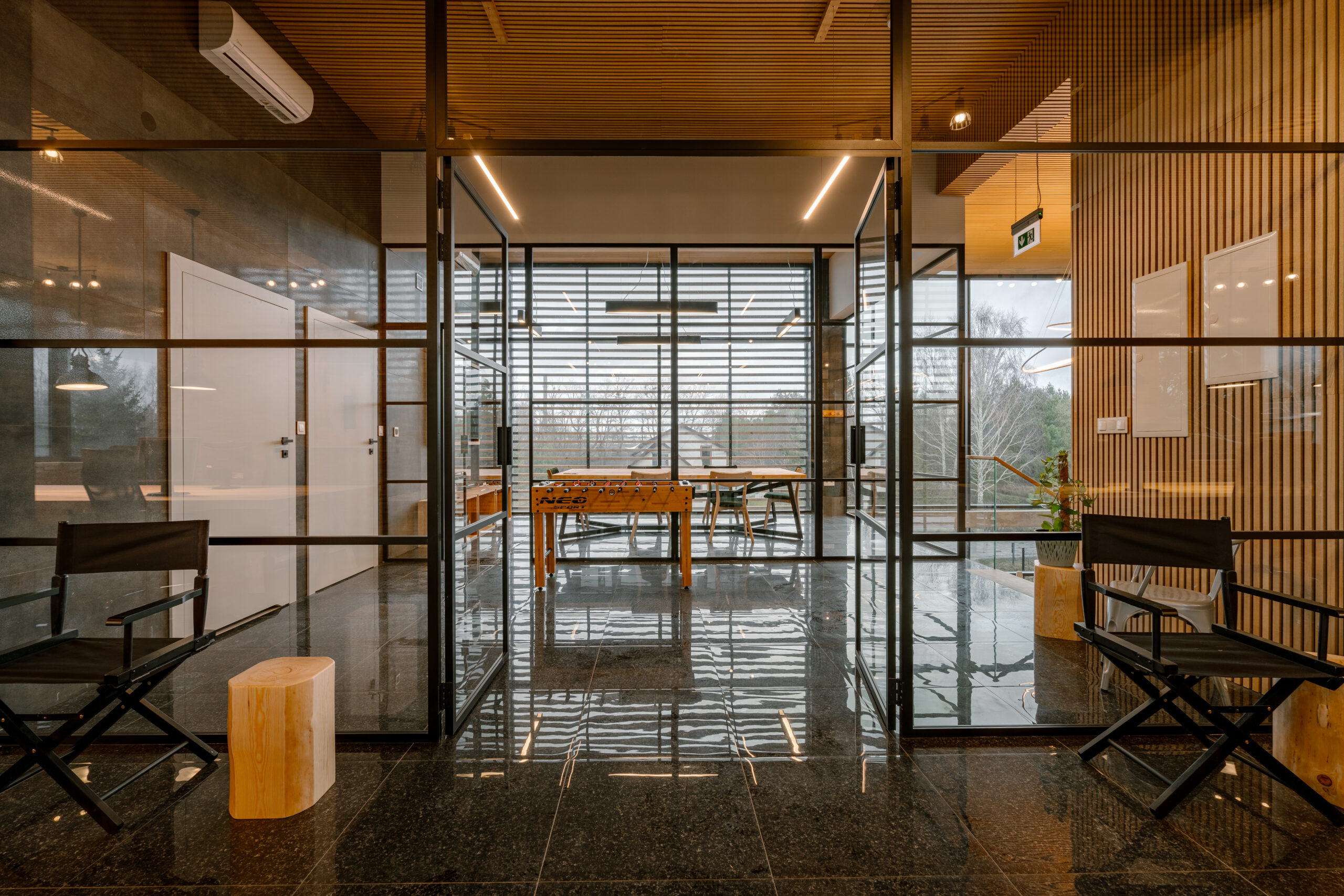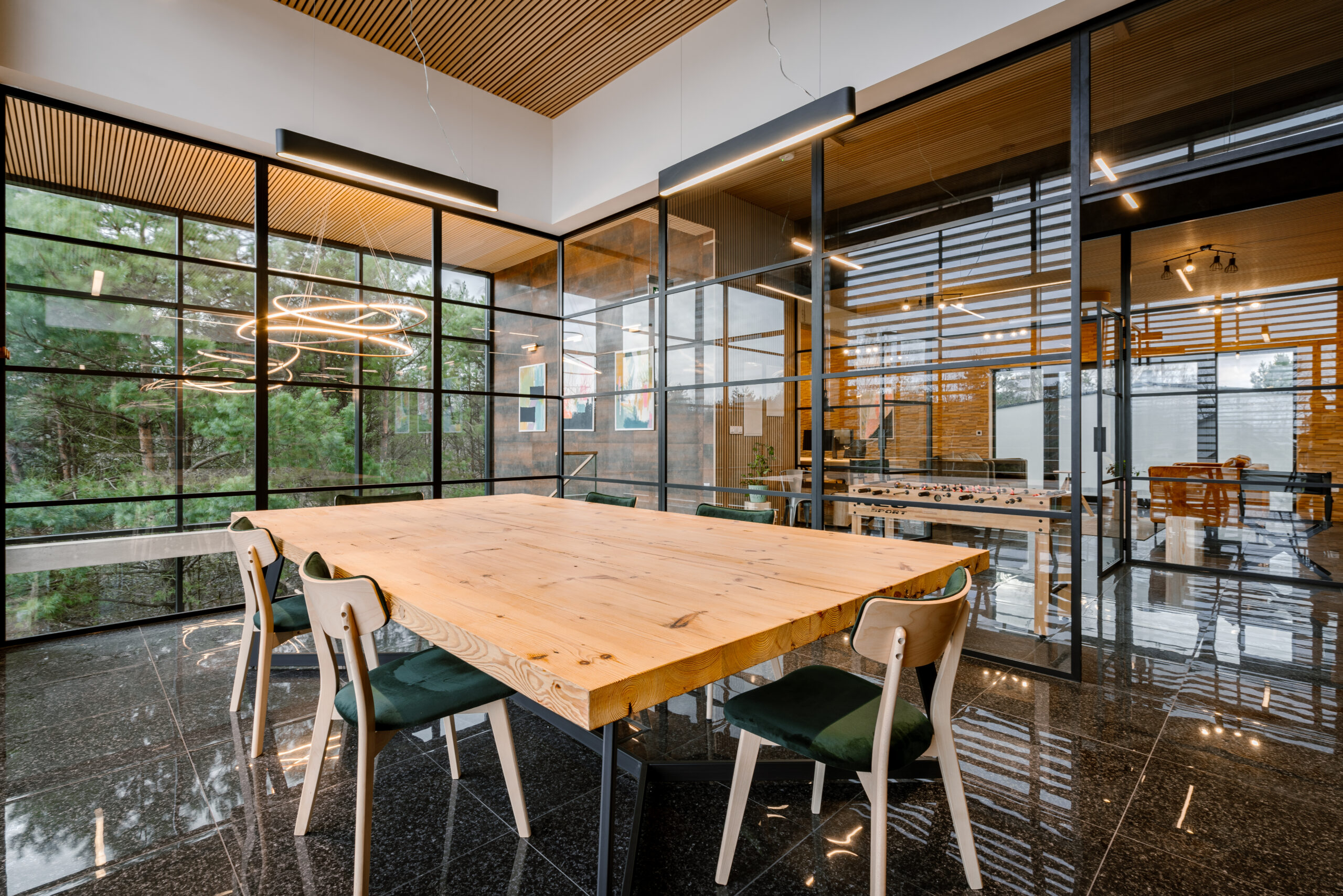 Duże ścianki oraz drzwi, wykonane dla przestrzeni biurowej , pokazują swoją nowoczesną odsłonę oraz zastosowanie w miejscu publicznym. Jedna ze ścianek, narożna, wyposażona w pojedyncze drzwi, tworzy osobny pokój do spotkań biznesowych. Jej elegancki wygląd i imponujące proporcje nadają pomieszczeniu prestiżowy charakter. Druga ścianka składa się z dwuskrzydłowych drzwi i znajduje się w komfortowym pomieszczeniu do pracy. Szkło pozwala na swobodny przepływ światła do wnętrza, tworząc przyjemną, jasną atmosferę. Co więcej, otaczająca przyroda, widoczna przez przeszklone ściany, sprawia, że całe pomieszczenie jest połączone z naturą. Drzewa i otoczenie przenikają do środka, tworząc wyjątkowy i relaksujący klimat. To miejsce jest doskonałe do pracy i spotkań biznesowych, łącząc elegancję z funkcjonalnością i bliskością z naturą.