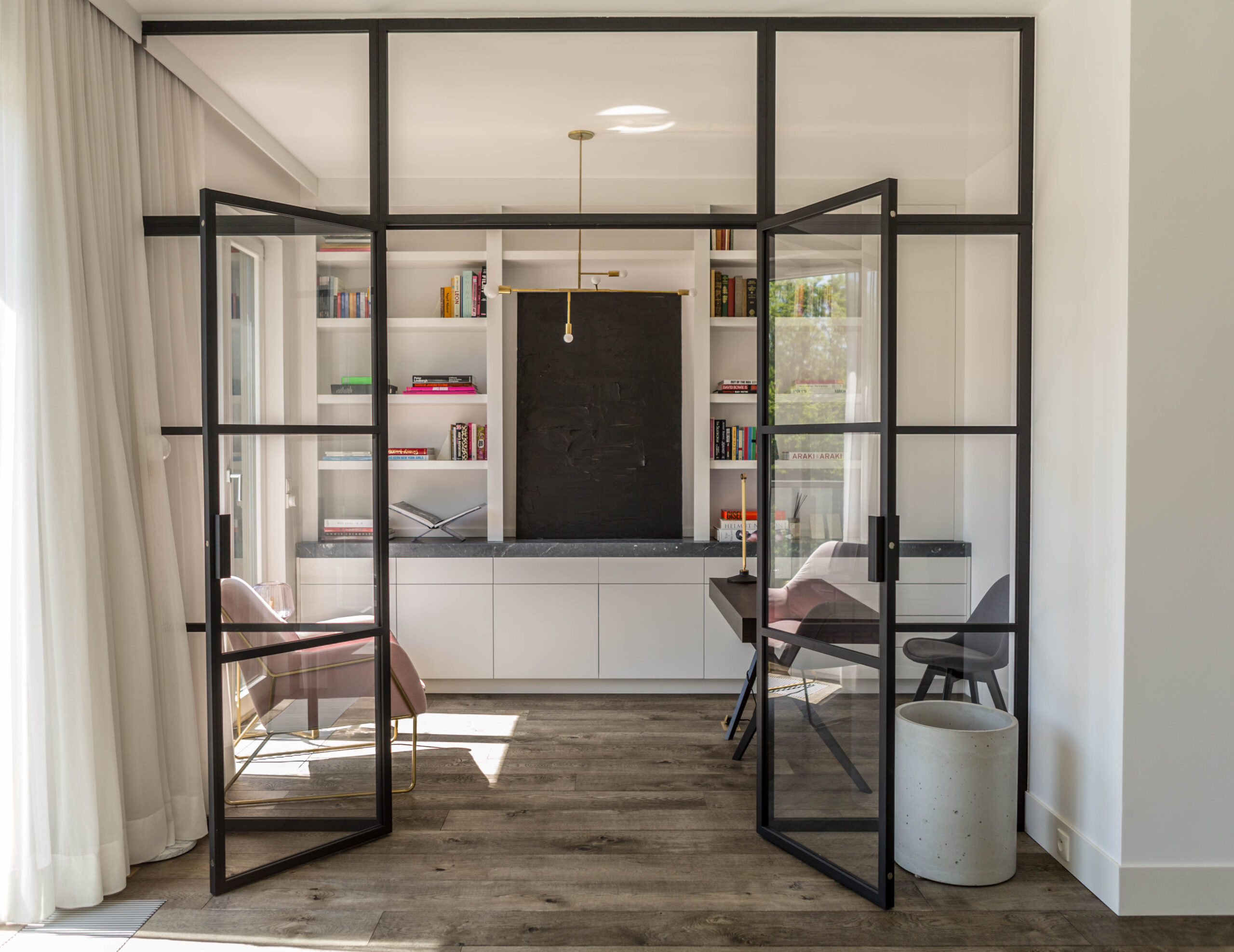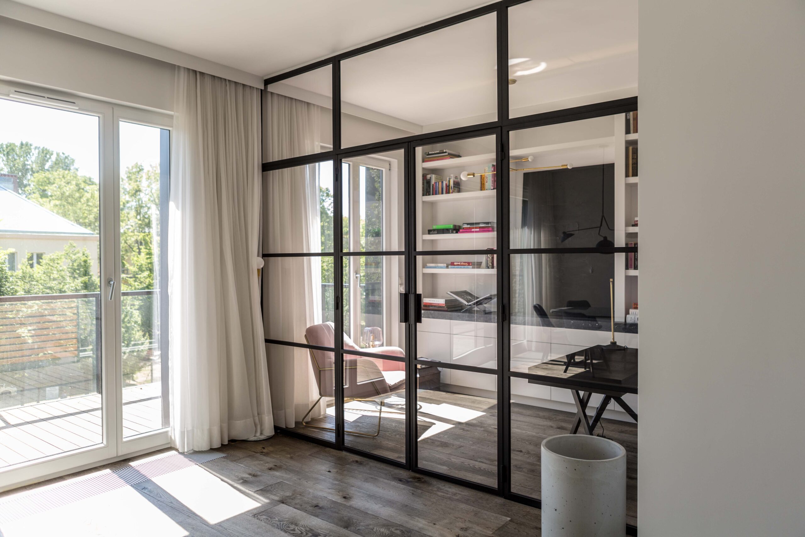 Piękna, duża ścianka z podwójnymi drzwiami, z możliwością pełnego otwarcia na boki, która wydziela przestrzeń do pracy. Dzięki swojemu designowi, nie tylko pełni praktyczne zadanie, ale także wspaniale komponuje się z wnętrzem, nadając mu charakteru i elegancji. Szklane panele przepuszczając naturalne światło powodują, że mieszkanie pozostaje jasne i przestronne.