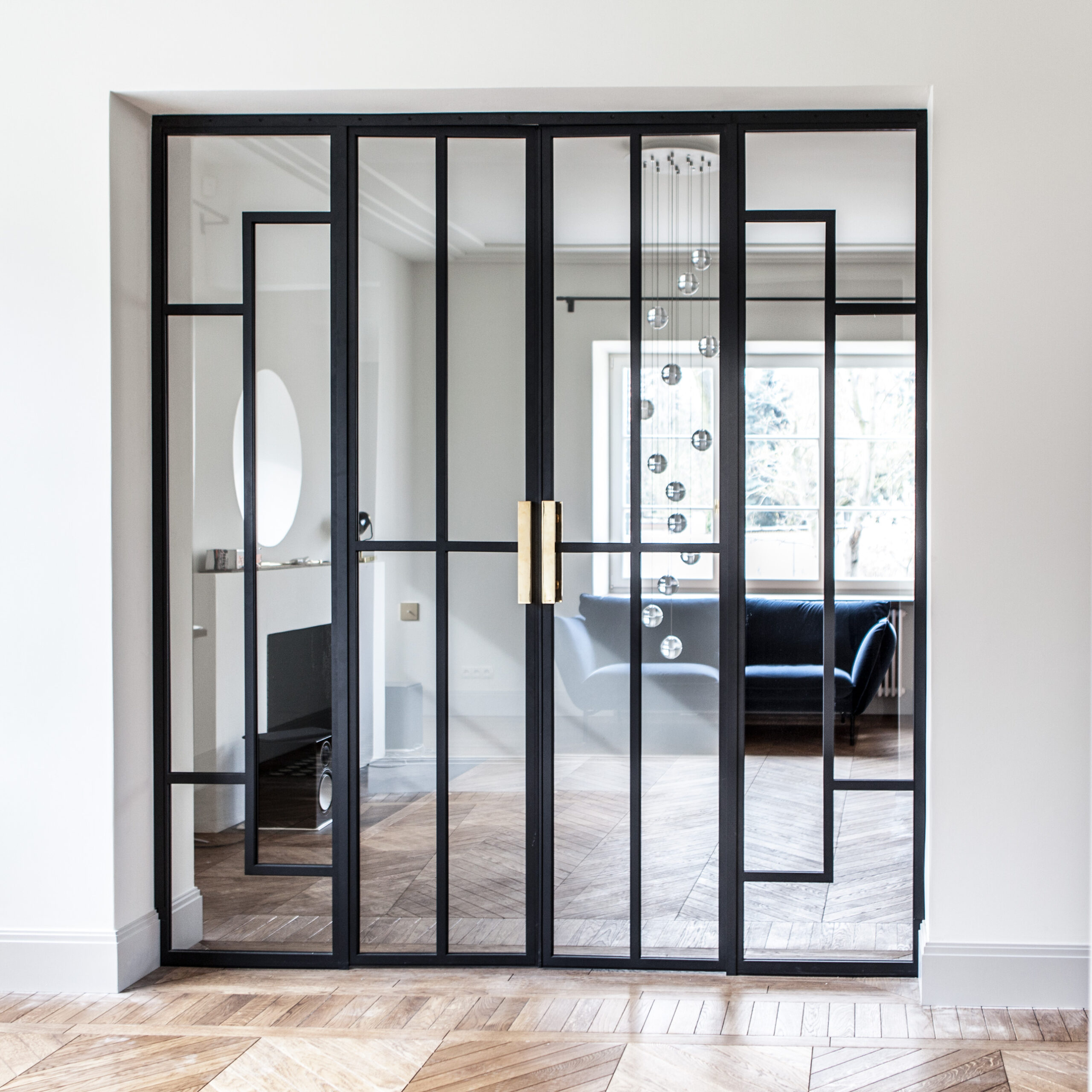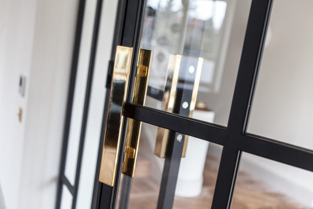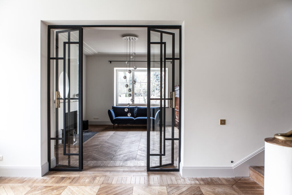 Szklane drzwi z ozdobnymi detalami stanowią tu przejście pomiędzy holem, a salonem. Oryginalne ułożenie szprosów na szkle, tworzy piękny wzór, który idealnie komponuje się ze złotymi, mosiężnymi uchwytami. Całość nadaje przestrzeni unikalny, elegancki wygląd.